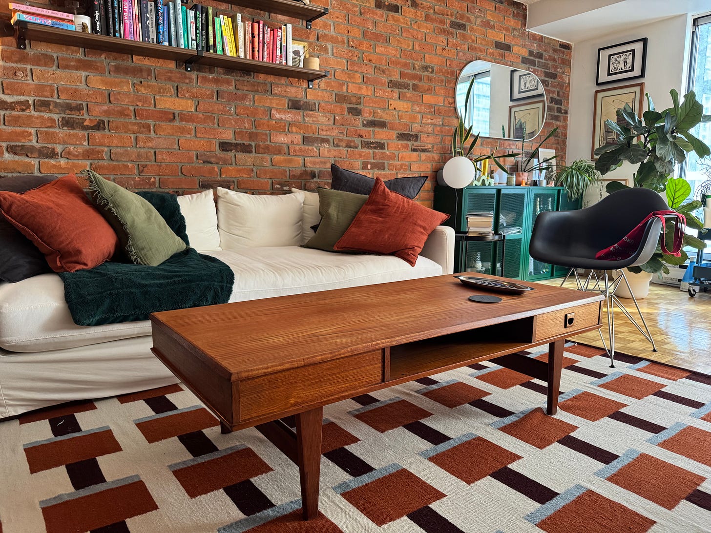 I am thrilled to announce I spent less than $1000, it’s an antique, so I don’t feel like a garbage bag from hell buying something that’ll break in 3 months from Structube and eventually end up in a landfill. I know I said my boyfriend doesn’t like antiques (What’s he doing with me then?! Badum-Chhh!) but we found a really cute mid-century coffee table at an antique market. I bought it from an absolutely insane woman who mostly haggled herself down from $750 to $500 dollars and I am thrilled she did.